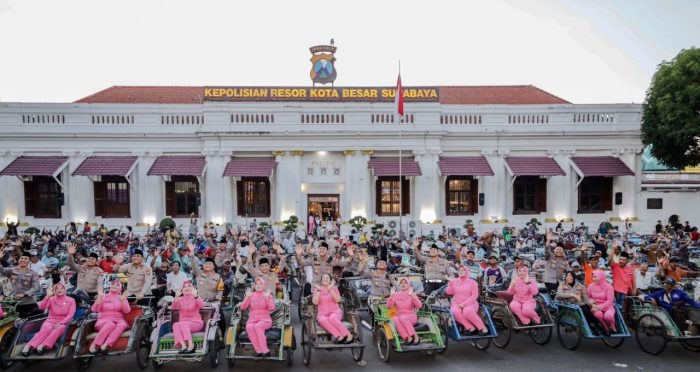 Kapolrestabes Surabaya Polda Jatim, Kombespol Pasma Royce bersama ibu ketua Bhayangkari Ibu Vita Pasma dengan didampingi Pejabat Utama (PJU) langsung menyapa sekitar 600an abang becak yang sengaja diundang untuk berbuka puasa bersama dan membagikan paket sembako.